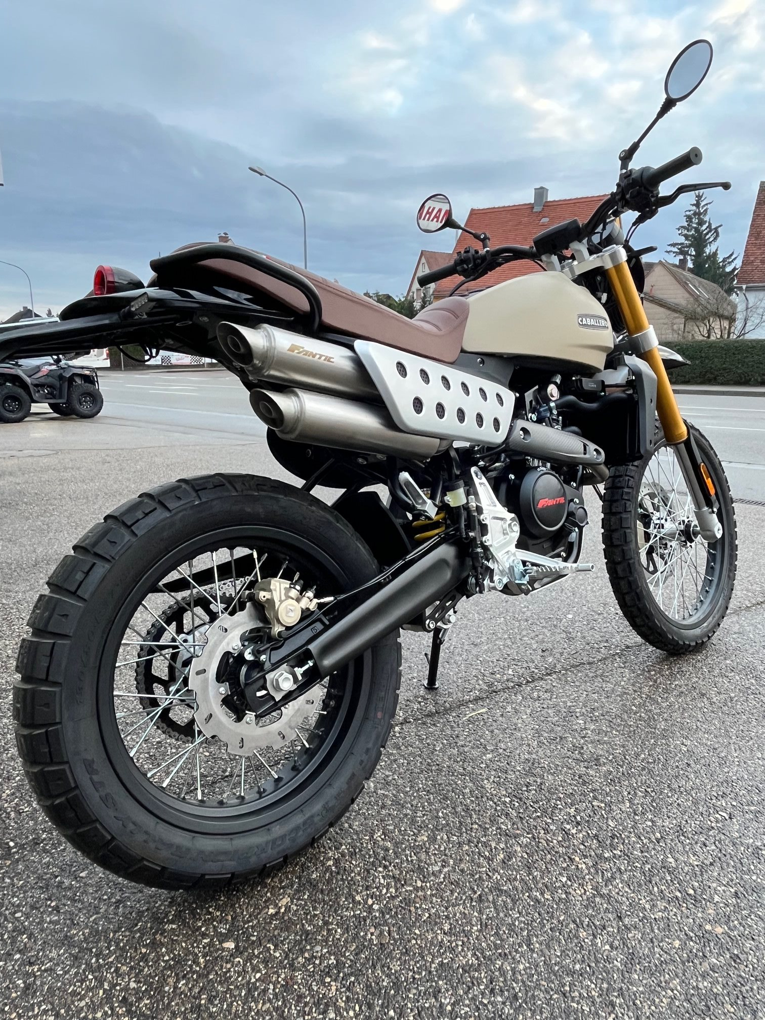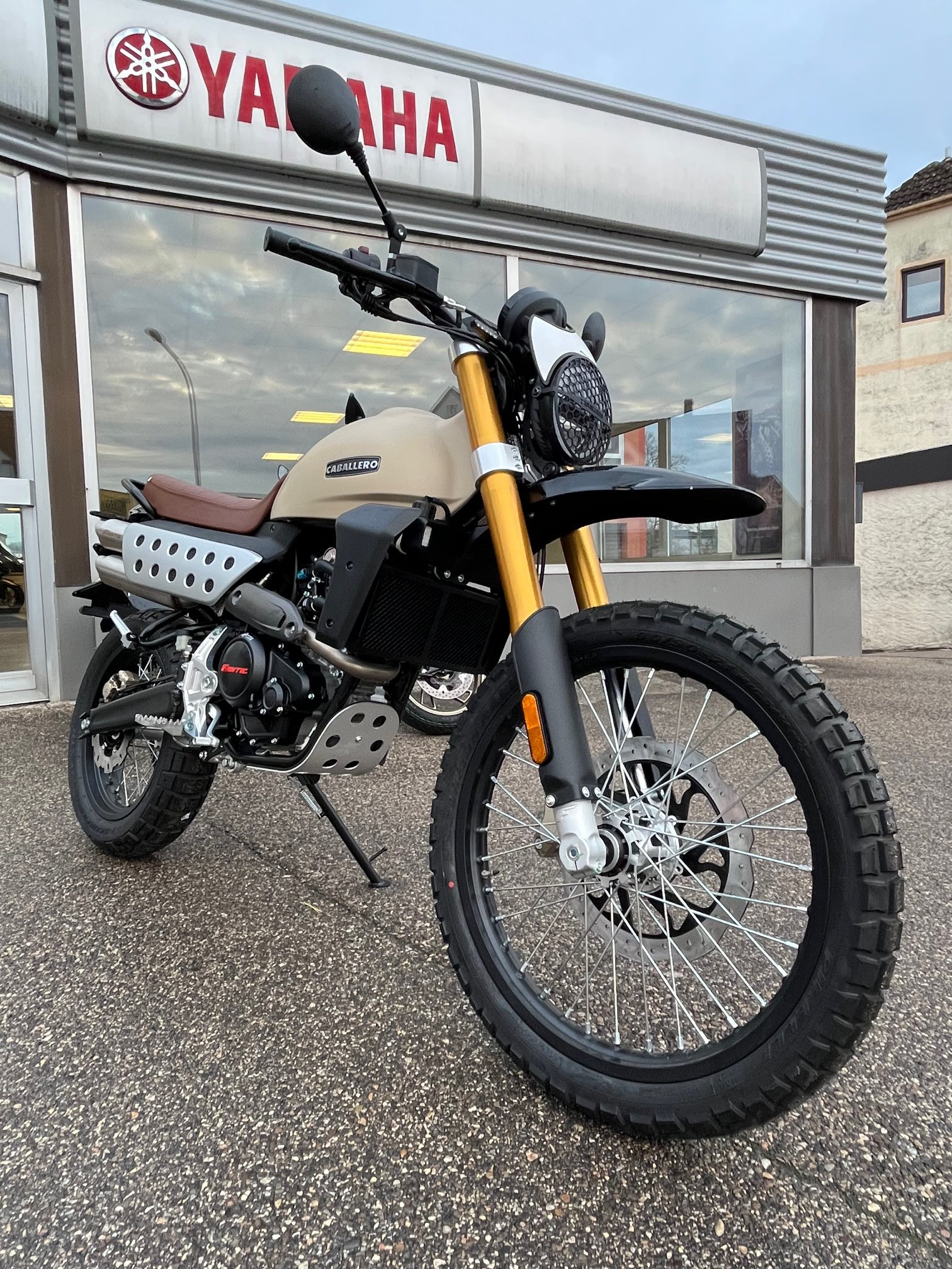 Der Caballero 125 Rally verkörpert perfekt den Offroad-Geist, unterstrichen durch technische und stilistische Details, die seine Geländetauglichkeit hervorheben. Die höhergelegte Vorder- und Hinterradaufhängung sorgt für einen größeren Federweg und ermöglicht es, auch die anspruchsvollsten Gelände mühelos zu bewältigen.